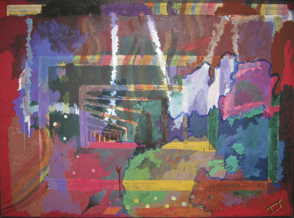 Newspaper, glue, and spray paint on primed canvas
